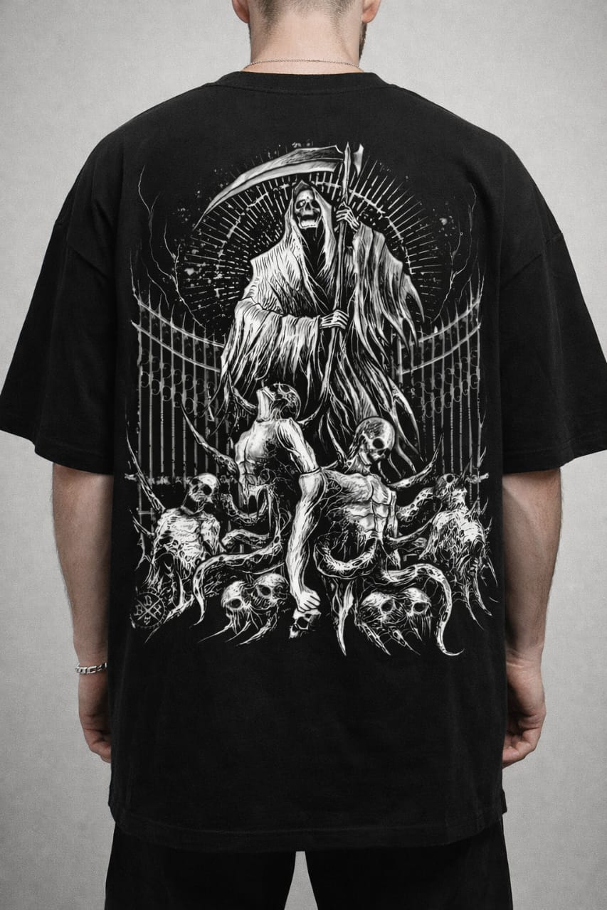 Crafted from premium heavyweight cotton, this oversized black tee features a minimal front chest print for a clean, luxury look, while the A3-sized back graphic unleashes chaos. The detailed Grim Reaper artwork symbolizes dominance, mortality, and power—designed to turn heads without saying a word.